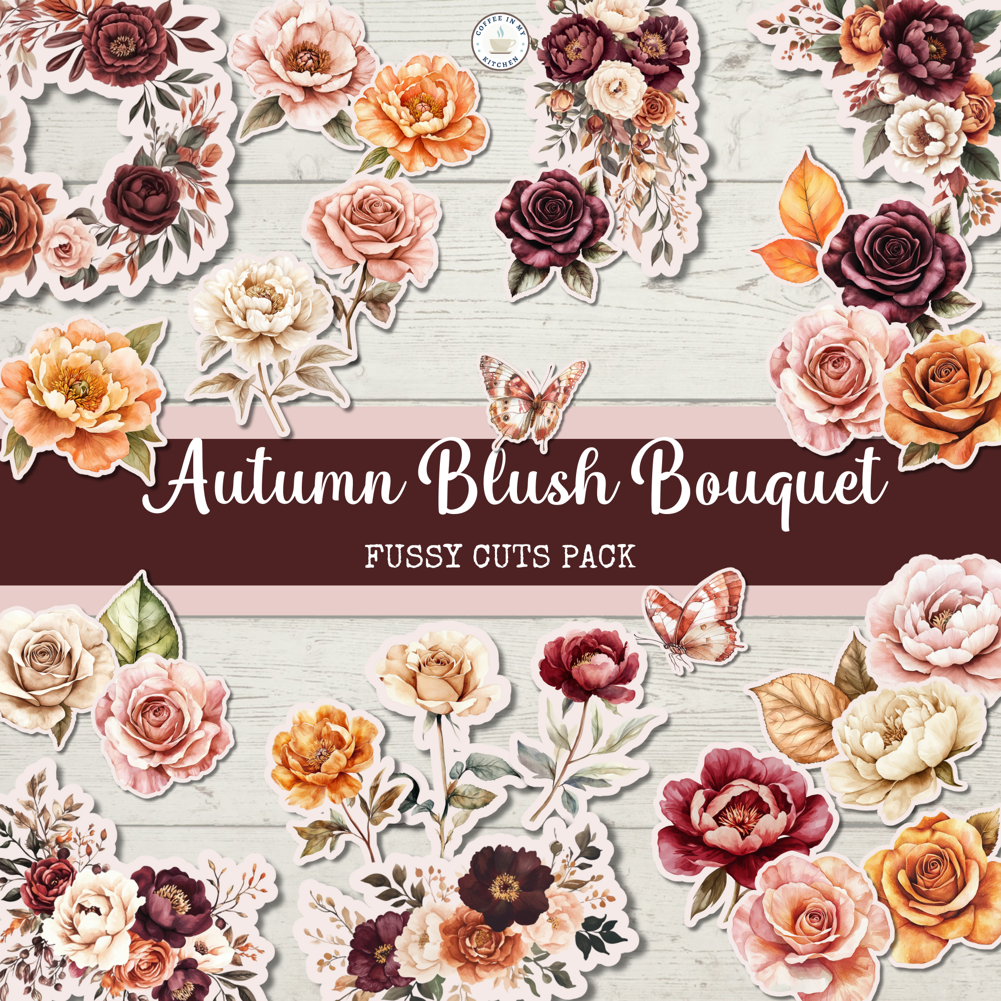 🌹🦋🍂 Wrap your projects in the soft beauty of Victorian autumn florals with this stunning collection of roses, peonies, butterflies, and fall foliage. The Autumn Blush Bouquet Fussy Cuts Pack captures the charm of antique botanicals with rich burgundy blooms, delicate pale pink petals, warm peach tones, and creamy ivory florals, arranged into blossoms, bouquets, wreaths, and decorative clusters.