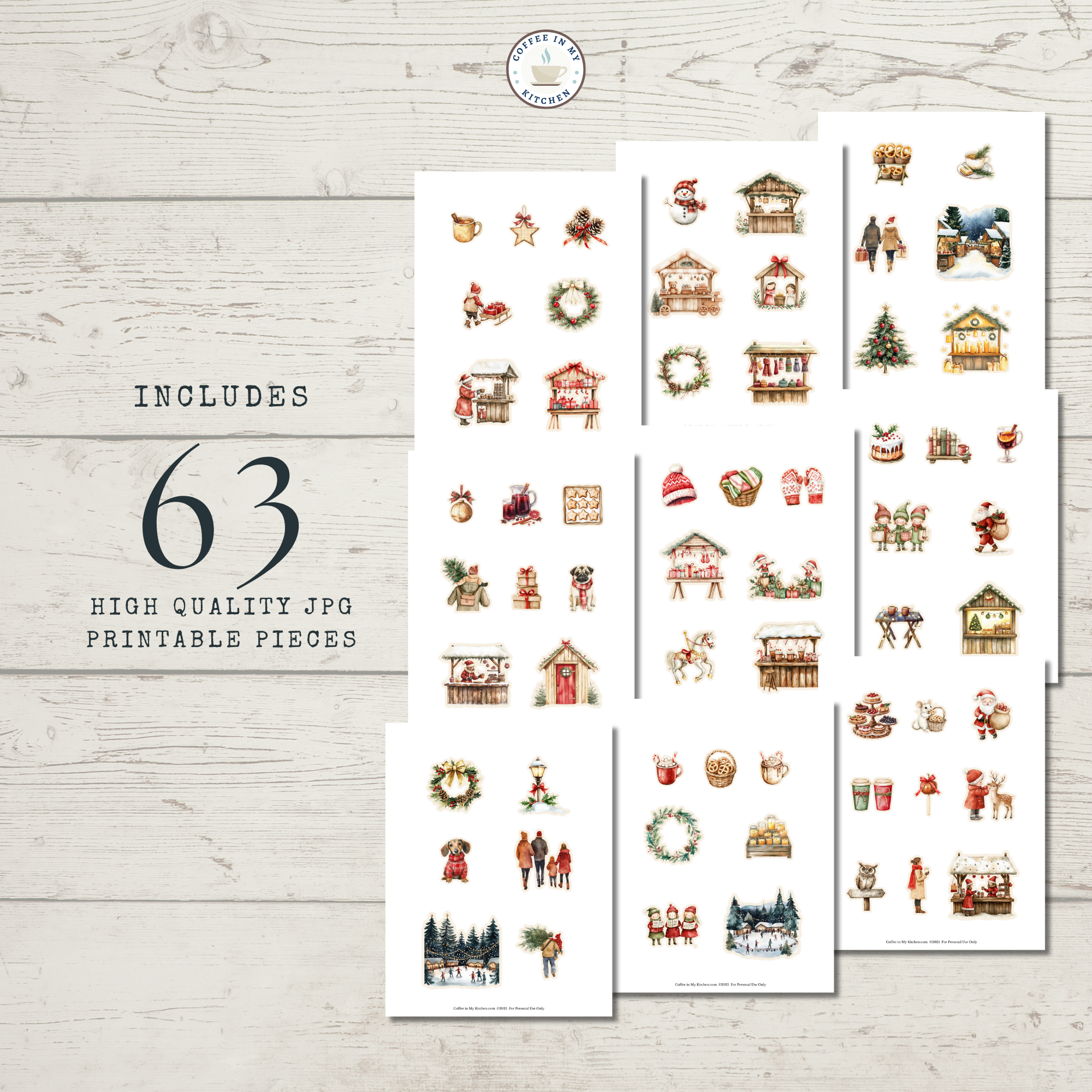 With 9 printable sheets and 63 total pieces, this collection is filled with heartwarming winter charm: apple cider stands, cheerful carolers, skating families, kids sledding and playing with baby reindeer, bundled-up couples, sweet bakery treats, decorated pine trees, adorable dogs in sweaters, shining streetlamps, snowmen, wrapped gifts, Santa Claus, and more.
