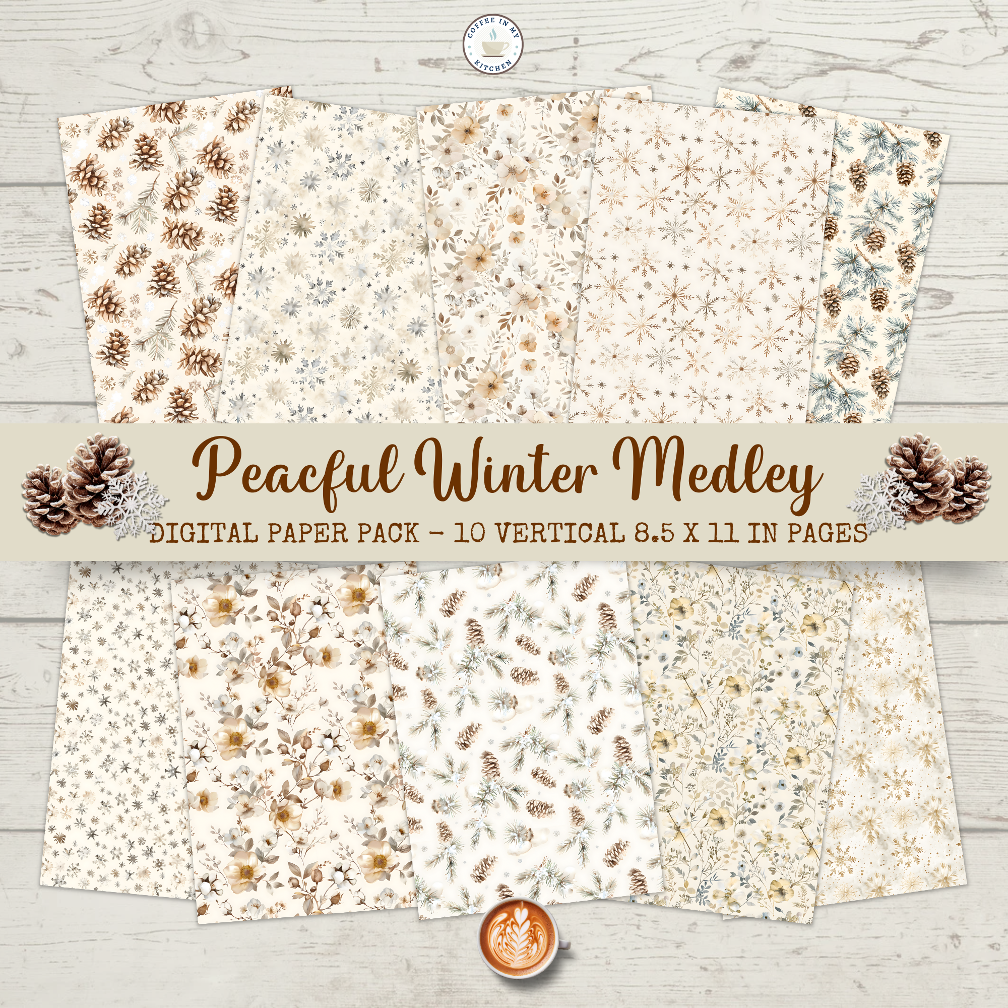 ✂️❄️🌿 Embrace the quiet beauty of winter with this soothing collection of botanical-inspired digital papers! The Peaceful Winter Medley Digital Paper Pack features calm, seamless patterns inspired by snow-dusted forests, winter florals, and gently falling snowflakes, all wrapped in a soft, neutral color palette.