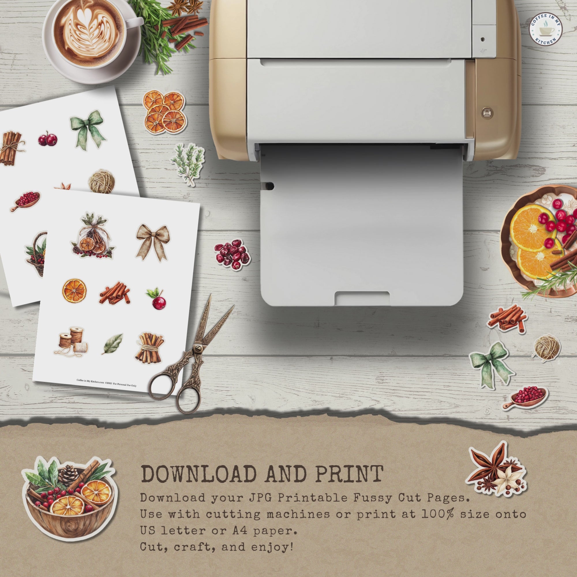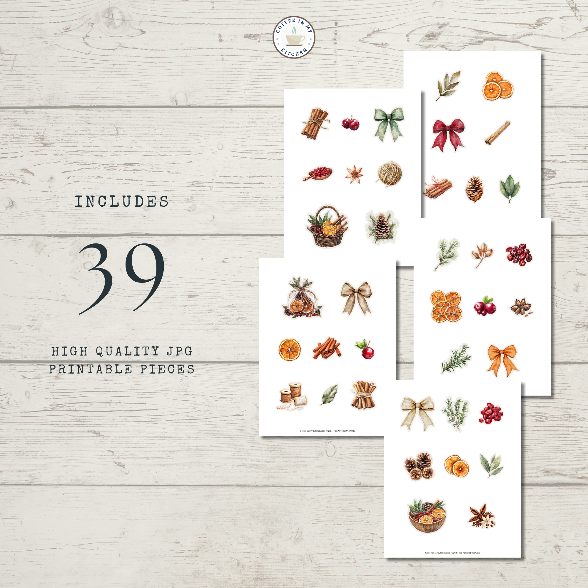 Perfect for cottagecore lovers, nature-inspired crafting, and anyone who adores earthy holiday aesthetics, these printable embellishments are designed to bring rustic warmth to your journals, scrapbooks, cards, tags, and winter memory projects. Print on sticker paper or cardstock to build your own DIY potpourri gift baskets, layered clusters, and cozy holiday spreads.